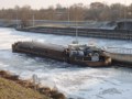 Loď zamrzla v místě kde se nedá sjet s autem dolů a na úzkou rampu se jeřáb který by auto sundal nedostane.Lodník bude muset chodit pěšky až do oblevy. (Toul, Francie)